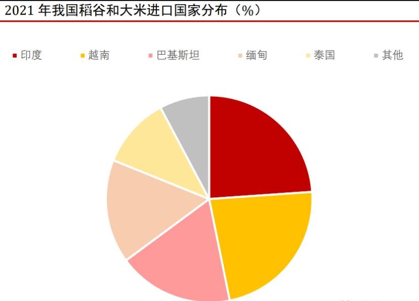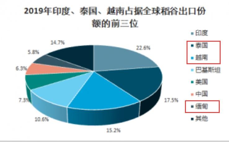 在二战以前,缅甸是世界上最大的稻米出口国。随着南亚、东南亚、东亚等国在稻米方面的发展,目前,缅甸的稻米出口份额约占世界的4%【图12~图13】,出口超百万吨,位列世界稻米出口前列。