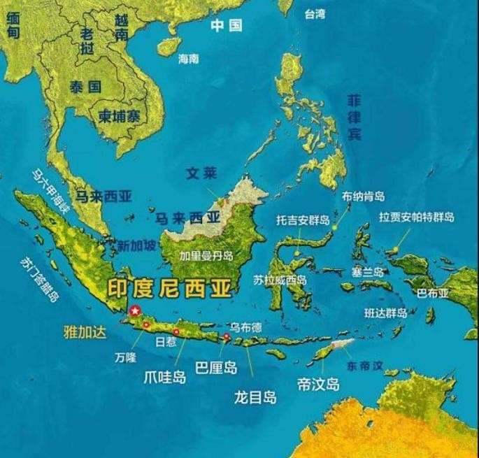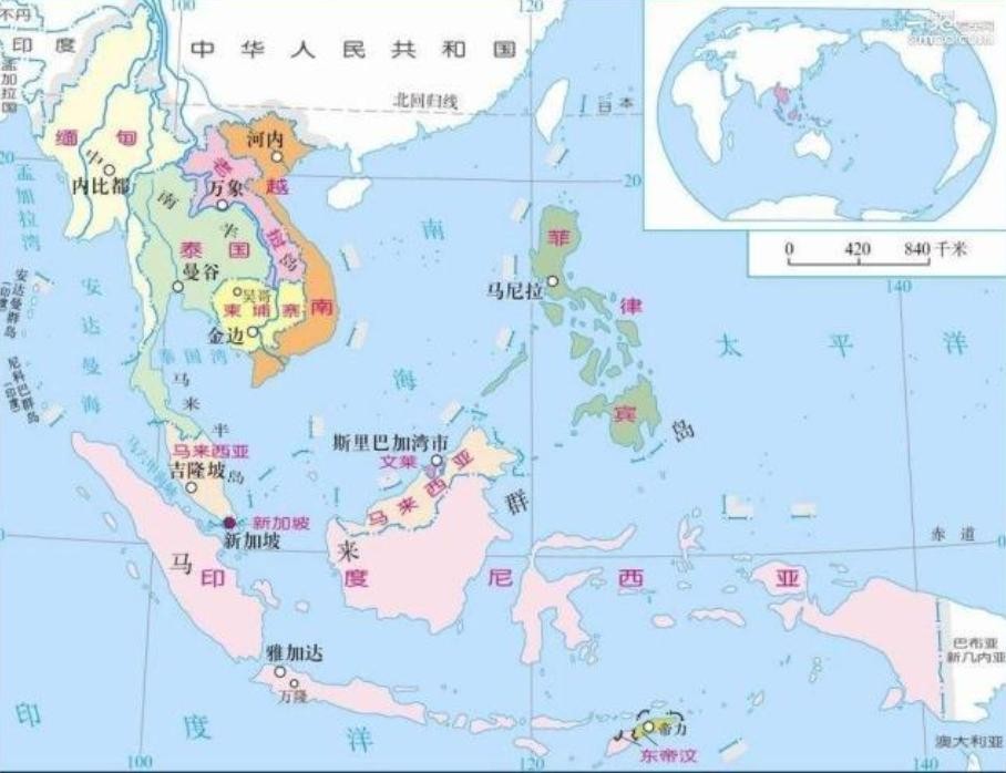 东南亚地区面积约457万平方公里【图5】,人口规模超过6亿。东南亚地区的国家【图6】有:中南半岛(缅甸、泰国、老挝、柬埔寨、越南)、马来半岛(马来西亚、新加坡)、马来(印尼)群岛(印度尼西亚、文莱、东帝汶)、菲律宾群岛(菲律宾)。