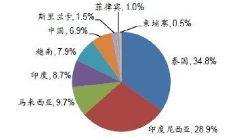 泰国的主要经济作物有橡胶、甘蔗、绿豆、麻、冻鱼、冻虾及各种热带水果。其中泰国天然橡胶和棕榈出口量均居世界首位。大米、橡胶【图22~23】、木薯、龙眼被列为泰国最重要的四大农产品,泰国是世界上最大的木薯产品出口国【图24~图25】,出口份额高达世界木薯产品出口总量的80%以上。