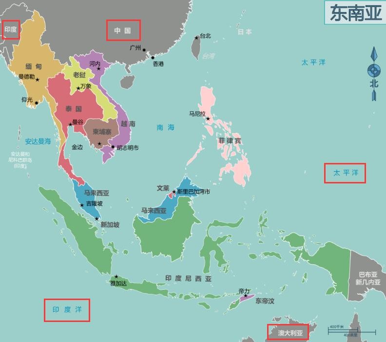 东南亚地理位置【图1】:北部与中国接壤、西北部与印度接壤、西部与印度洋相连、东部与太平洋相连、南部隔海相望大洋洲。