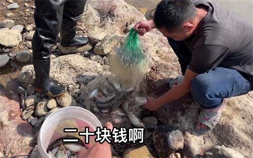 比如这位老乡黄师傅捕了有十几斤鱼,他表示只需30元就能全部拿走——最后被现场的这位当地户外主播讨价还价一番后,以20元的价格全部买走了。