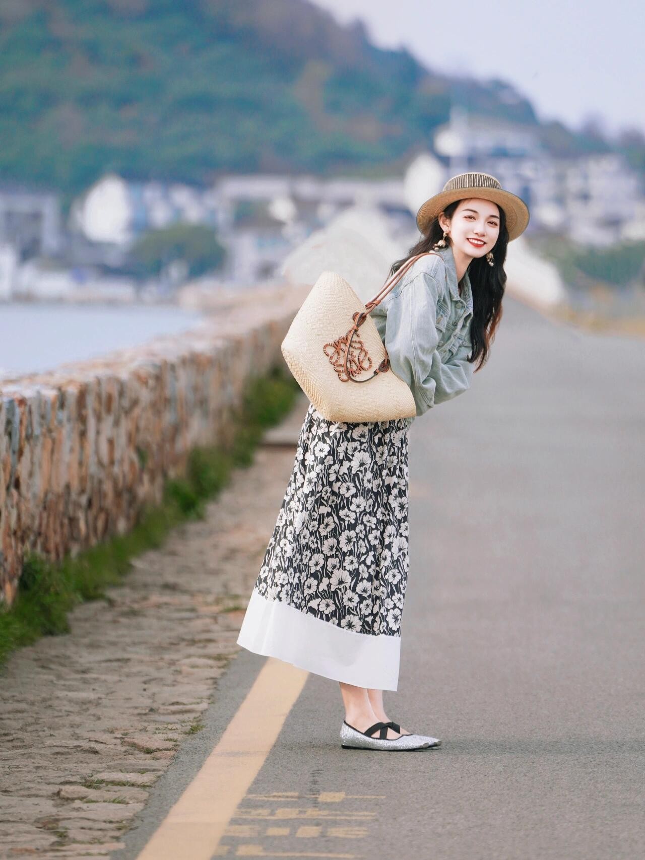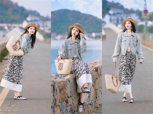 行走在海边的小道上,不看镜头的姿势往往更出片,学下面的模特一般,一手拎着包包,另外一手轻轻撑着帽檐,边走边眺望远处的海边美景,动感十足的姿势,自然生动且富含生活气息,随手一拍都很美。