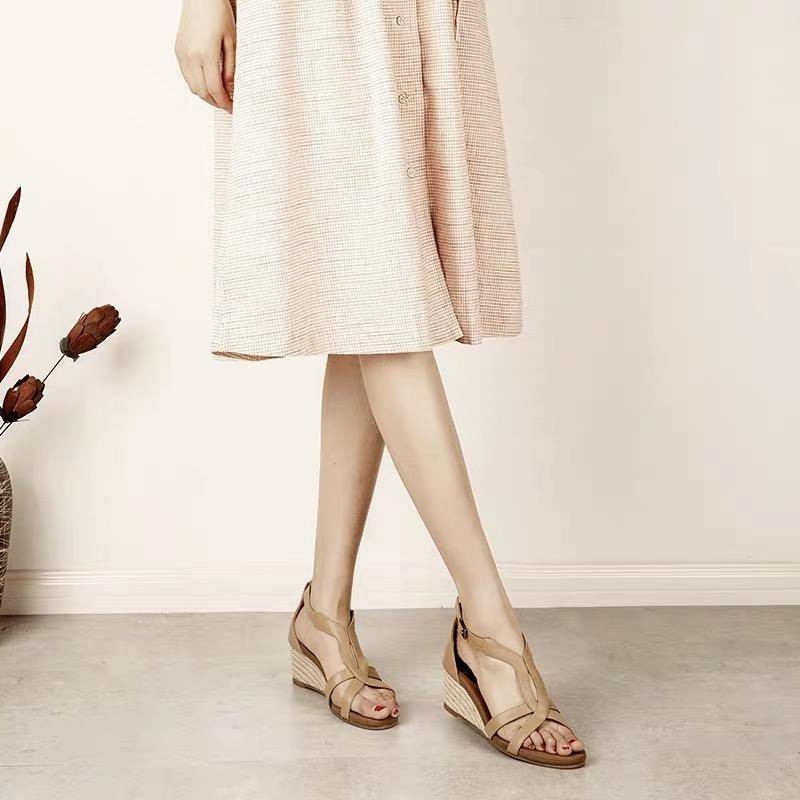看着就是一双别致的罗马凉鞋,从草编坡跟的设计上就能够感受到,可以说是比较有格调的一双凉鞋啦!