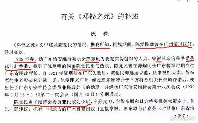 《邓铿之死》文中述及陈觉民的情况,据我所知,抗战期间,陈觉民确曾在广州做过汉奸,经过如此。