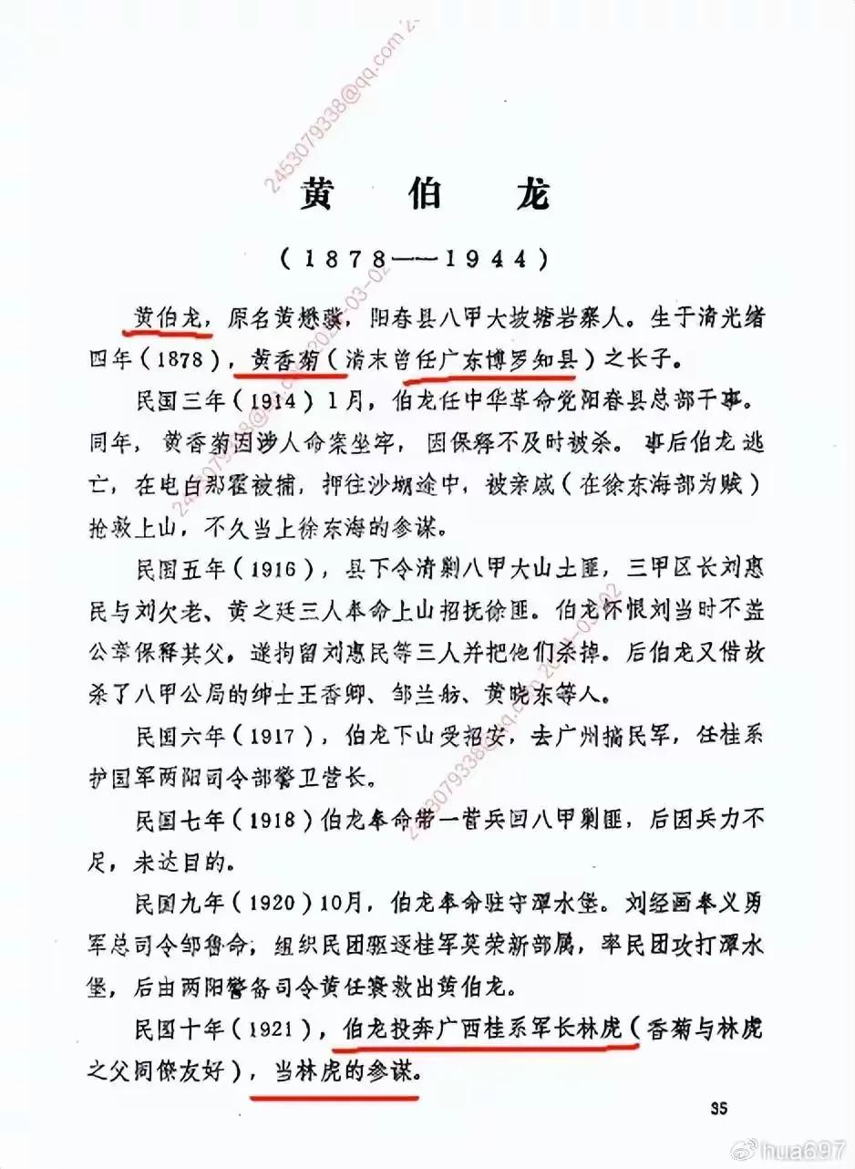 黄伯龙,原名黄懋骥,阳春县八甲大坡塘岩寨人。生于清光绪四年(1878),黄香菊(清末曾任广东博罗知县)之长子,......民国十年(1921年),伯龙投奔广西桂系军林虎(香菊与林虎之父同僚友好),当林虎的参谋。】