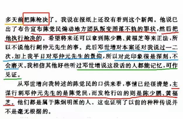 邓世增当时向我转述了陈觉民罪犯这些口供以后,并说:“陈虽没有供出仲元先生解散了他的粤军第七路部队,因而怀恨在心,引起杀机。但在我看来他之所以要主谋暗杀仲元先生,这必然是最主要的原因。”我便问邓现在对陈觉民打算怎样处理?他说已于十多天前把陈枪决了。我说在报纸上没有看到这个新闻。他说已出了布告宣布陈觉民煽动地方团队叛变图谋不轨的罪状,然后把他执行枪决的。希望将来还可以拿到陈少鹏,黄福芝等来正法,所以不说他行刺仲元先生的事。此后邓世增对本案还对我说过一二次,加上我平日对邓仲元先生的景仰,所以对此印象很是深刻,不会磨灭。我相信其他好些听过邓世增说这段话的人都能记忆,可作见证。