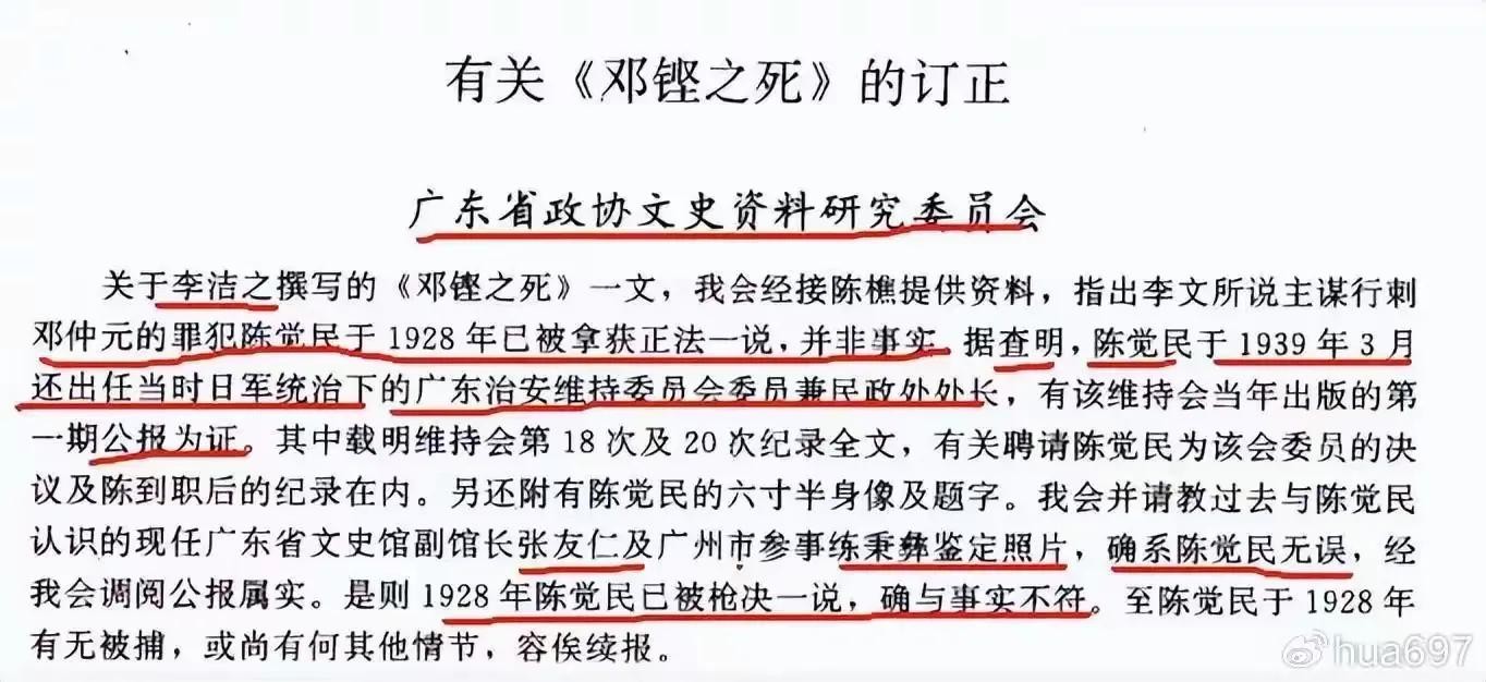 关于李洁之撰写的《邓铿之死》一文,我会经接陈樵提供资料,指出李文所说主谋行刺邓仲元的罪犯陈觉民于1928年已被拿获正法一说,并非事实。据查明,陈觉民于1939年3月还出任当时日军统治下的广东治安维持委员会委员兼民政处长,有该维持会当年出版的第一期公报为证,其中载明维持会第18次及20次记录全文,有关聘请陈觉民为该会委员的决议及陈到职后的记录在内。另还附有陈觉民的六寸半身像及题字。我会并请教过去与陈觉民认识的现任广东省文史馆副馆长张友仁及广州市参事练秉彝鉴定照片,确系陈觉民无误,经我会调阅公报属实。是则1928年陈觉民已被枪决一说,确与事实不符。至陈觉民于1928年有无被捕,或尚有何其他情节,容俟续报。】