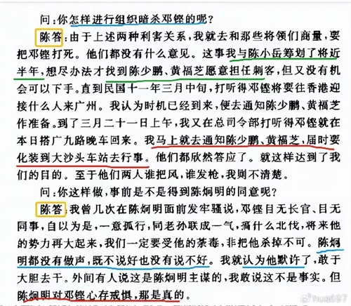 陈答:我曾几次在陈炯明面前发牢骚说,邓铿目无长官,目无同事,自以为是,一意孤行,同老孙联成一气,搞什么北伐,将来他的势力再大起来,我们一定要受他的荼毒,非把他杀掉不可。陈炯明都没有做声,既不说好也没有说不好。我认为他默许了,敢于大胆去干。外间有人说这是陈炯明主谋的,我敢说这不是事实。但陈炯明对邓铿心存戒惧,那是真的。
