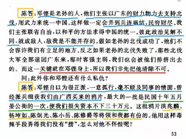 陈答:邓铿是老孙的人,他们主张以广东的财力物力去支持北伐,用武力来统一中国。这样做一定会弄到兵连祸结,民穷财尽。我们主张联省自治,以和平的方法求得中国的统一。彼此政治见解不同,就成敌人,敌我是不能并存的。假如老孙的北伐成功了,他们不会容许我们有立足的地方。反之如果老孙的北伐失败了,那些北伐大军全部退回广东来,那时客强主弱,我们也会被他们排挤出去的。而这一关键就在邓铿身上,所以我们非先把他清除不可。