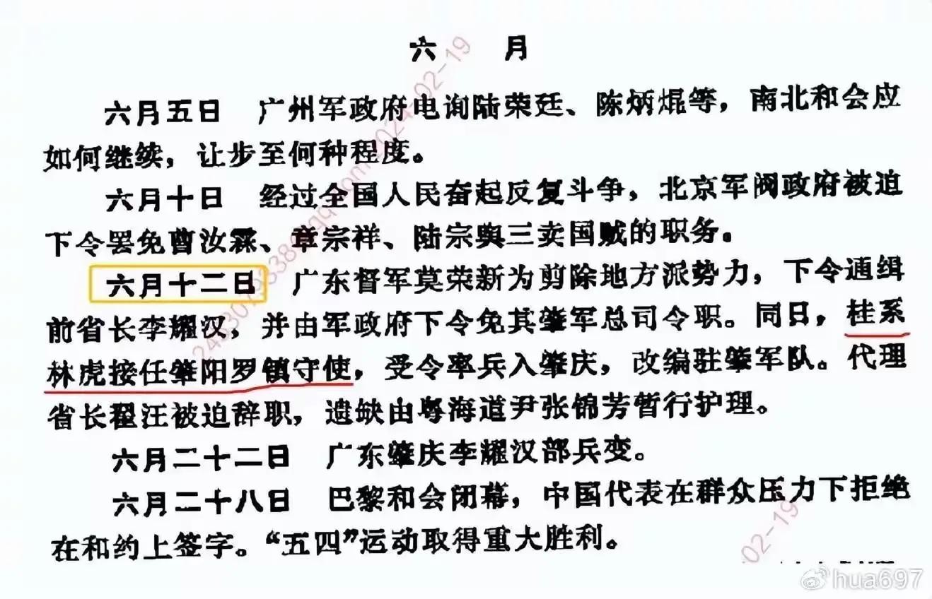 【图23,《广州百年大事记》186页:1919年,6月12日,广东桂系督军莫荣新,为剪除地方派势力,下令通缉前省长李耀汉,并由军政府下令免其肇军总司令职,又桂系将领林虎接任肇,阳,罗镇守使。】