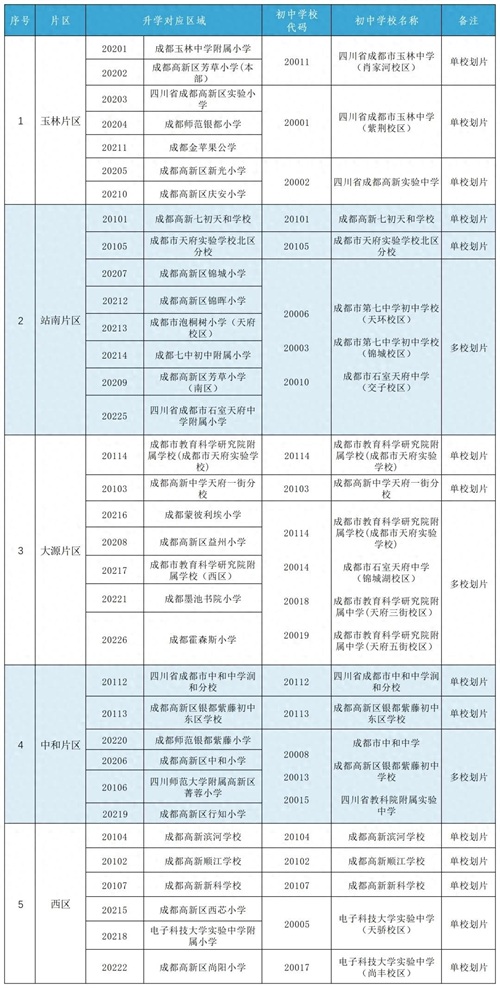 2024年成都高新区小学毕业生初中入学划片范围一览表