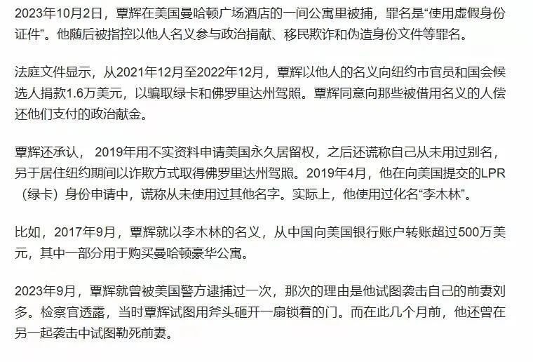 面临多项严重指控:通过他人名义进行政治捐款,扰乱选举秩序;申请美国绿卡时提供虚假资料,实施移民欺诈;甚至还有家庭暴力指控,试图攻击妻子并用斧头劈开卧室门锁,行径令人咋舌。