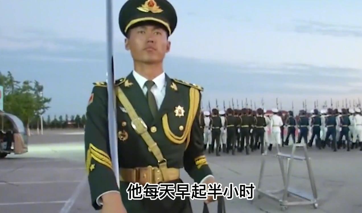 俗话说,台上一分钟,台下十年功。张自轩为了能够完美地完成升旗仪式,他付出了比他人更多的努力。因为他本不是升旗手的最佳人选,只是一个替补人员,但他为了提升自己,每天起早贪黑地练习,除了日常的训练,他每天早起半小时,然后就扛着国旗杆跑五公里热身,之后才开始日常训练。