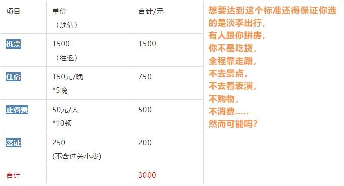 机票2200元+住宿850元+吃饭500元=3550元,到了当地你要全程走着,还不能坐公共交通,不能进花钱的景区,那么你那么远坐飞机去干什么?而且你去了以后语言不通很有可能被坑。