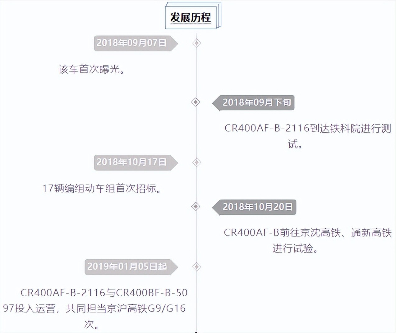 2012年开始启动相关工作;2013年6月“中国标准”动车组项目正式启动;2013年12月总体技术条件制定完成;2014年9月方案设计完成(外观由英国PriestmanGoode公司设计);2015年6月30日,CR400AF首组样车下线。
