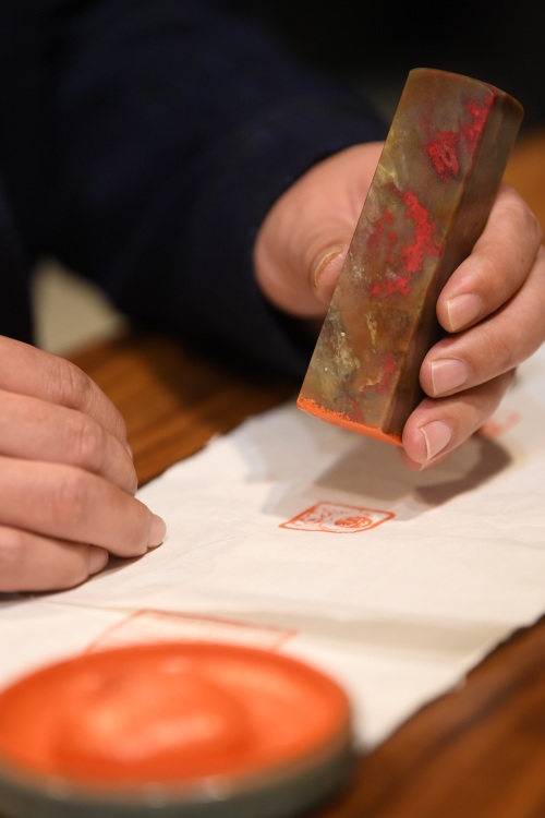 ↑雕刻师在中国工艺美术大师钱高潮的工作室雕刻一枚印章(11月5日摄)。