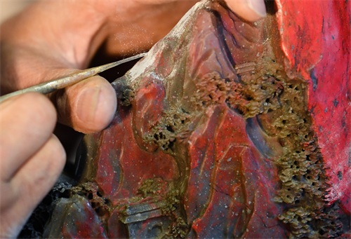 ↑中国工艺美术大师钱高潮创作的鸡血石雕刻工艺品《鸿运山庄》局部(11月5日摄)。