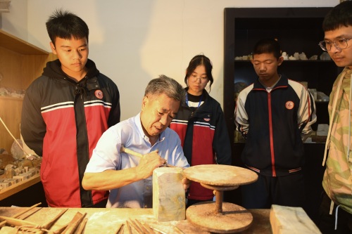 ↑昌化职业高级中学石雕班学生来到昌化鸡血石雕传承基地学习(11月5日摄)。