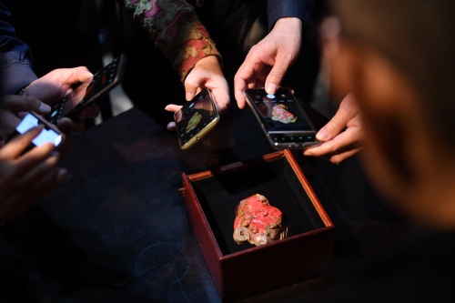 ↑游客在临安昌化镇昌化国石印象馆参观拍摄鸡血石雕刻工艺品(11月6日摄)。