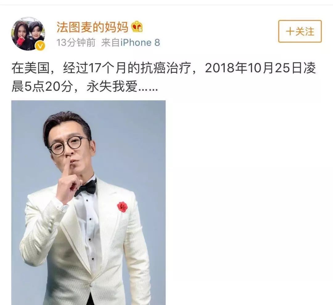 今天早上9点31分,微博名为法图麦的妈妈的用户发博文称,“经过17个月的抗癌治疗,2018年10月25日凌晨5点20分,永失我爱…”