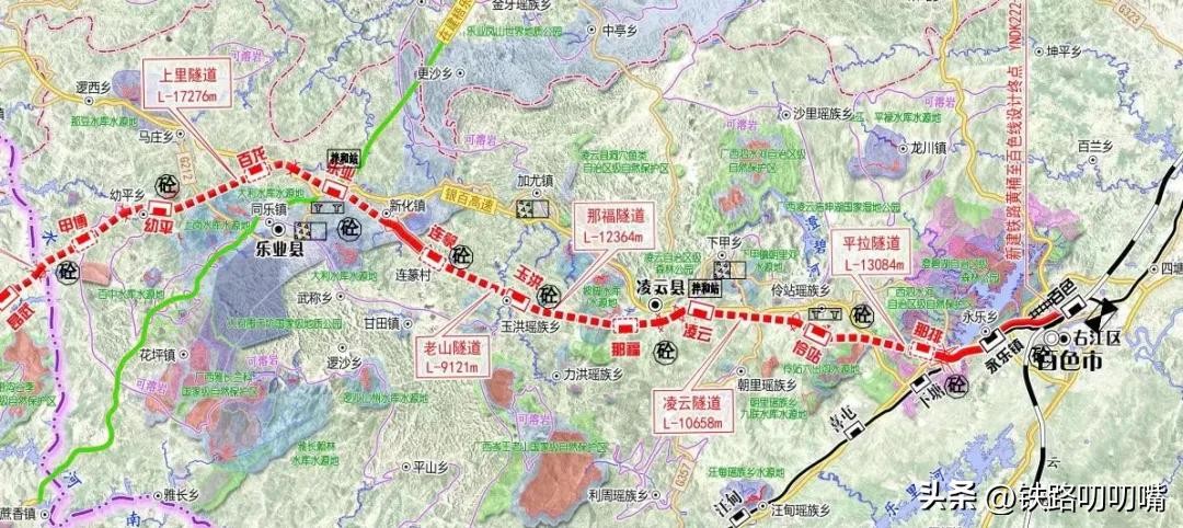 黄百铁路今年初才正式开工,计划2028年建成通车。该铁路位于贵州、广西境内,设计时速160公里,为国家Ⅰ级单线电气化客货共线铁路,其中广西段正线长约139公里,经百色市乐业县、凌云县、右江区,引入百色站。