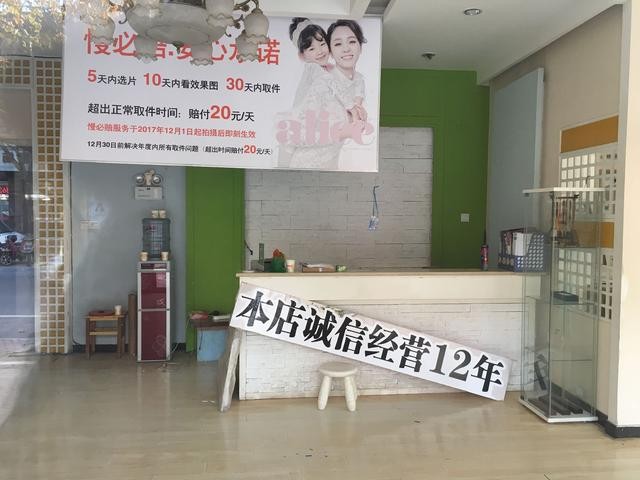 10日上午9时30分,记者来到了位于鹿泉区第二实验小学附近的大风车专业儿童摄影店。店铺大门紧闭,玻璃门上依然贴着“暂停营业”的通知,透过玻璃门可以清楚地看到店铺里悬挂着一个广告宣传牌,内容为:“5天内选片,10天内看效果图,30天内取件,超出正常取件时间赔付20元一天,赔付服务于2017年12月1日起拍摄后即可生效。”宣传牌下面是一张斜放在地面上的长方形牌子,写着:“本店诚信经营12年”。这两块宣传牌和现在萧索的店铺显得有些格格不入。