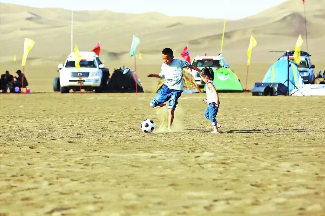 小朋友在库木塔格沙漠腹地踢足球。新疆日报记者唐堪东摄