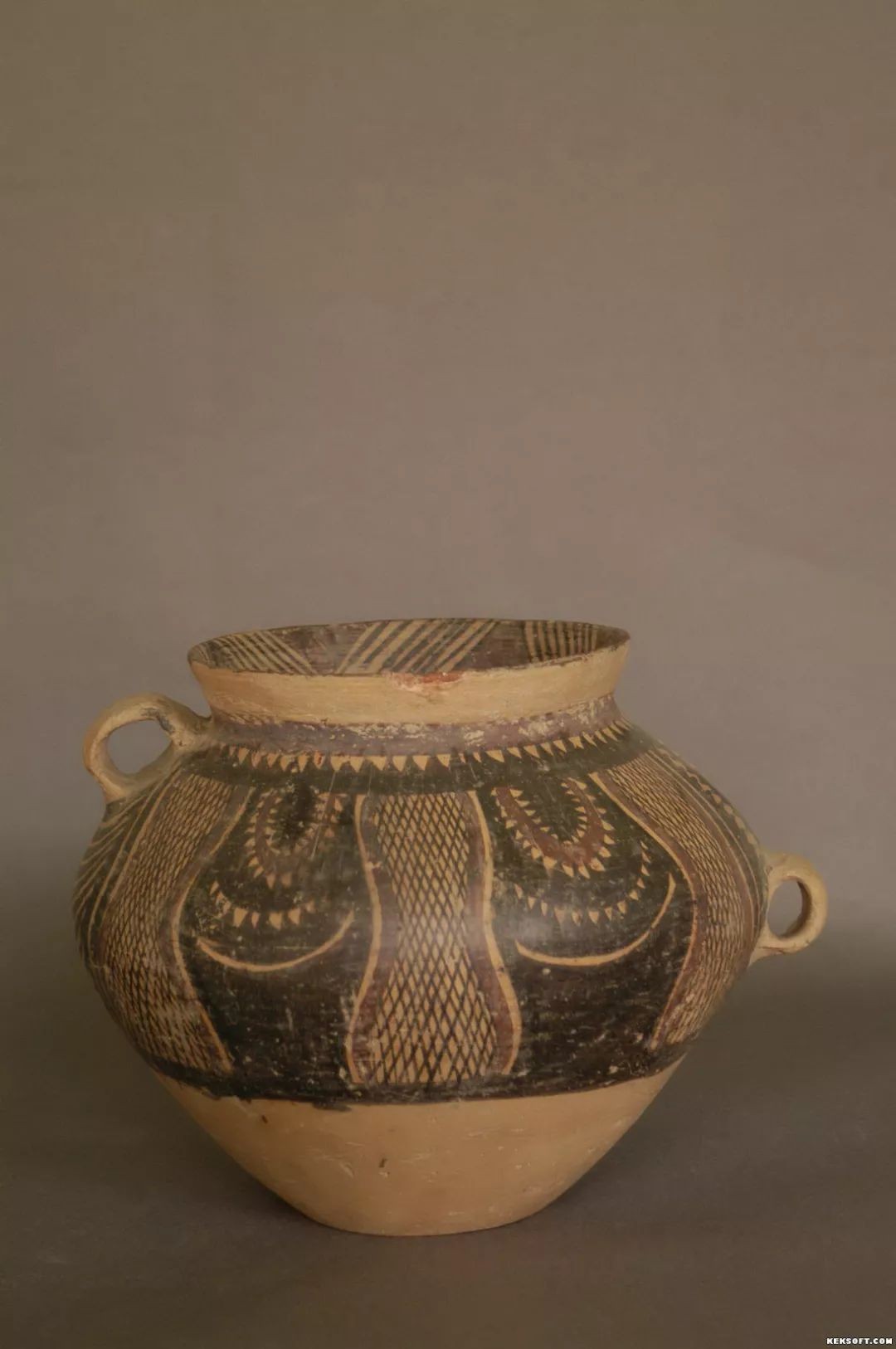 采集于临夏州康乐县虎关乡边家林遗址。马家窑文化器物。现藏于临夏州博物馆,属国家一级乙类文物。通高20厘米,腹径23.8厘米,口径15.6厘米,底径9.6厘米,重1.090千克。质地为泥质橙黄陶,撇口,短束颈,斜肩,鼓腹,平底,肩部、腹部各饰一耳,呈高低耳状。器物表面处理的十分精细,打磨的比较光亮,造型对称规整。主体施黑、红彩,口沿内饰斜平行线纹,间以红彩三角纹,颈部饰黑红彩锯齿纹,肩腹部主体纹饰为六组葫芦形网纹,其间饰垂弧状锯齿纹,这些纹饰主要采用黑红二彩描绘。下腹至底部平素无纹。