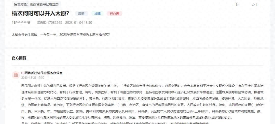 针对网友在领导留言板提出的太榆合并问题,官方回复指出,《行政区划管理条例》第二条规定,行政区划变更需要符合一系列原则,目前太榆合并尚未符合任何原则,因此暂无具体的变更计划。官方回复还鼓励网友继续关注山西经济社会发展,并向省委建言献策,用实际行动推进地方发展。