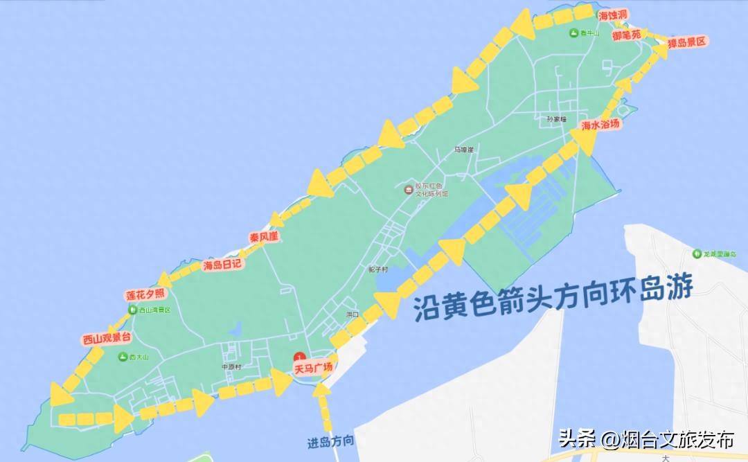 养马岛大桥→天马广场→海水浴场→獐岛→御笔苑→海蚀洞→秦风崖→海岛日记→莲花夕照→西山观景台