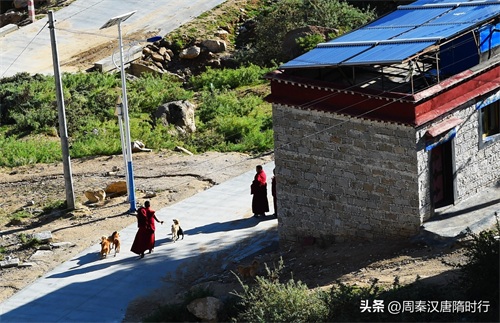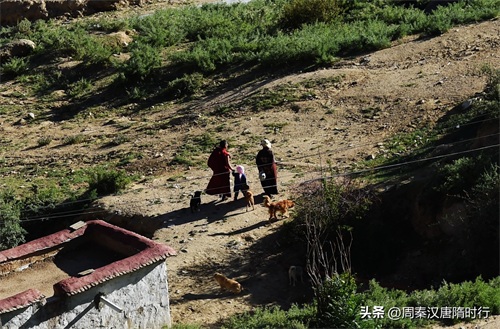 藏区人们都喜欢养狗,法国传教士古伯察在《鞑靼西藏旅行记》中写道,那里的人都喜欢养狗,特别是黑色的大狗,甚至不怕得疯狗病。现在,村前村里村后,特别是寺庙周边,有大量的流浪狗,他们没有固定的主人,善良的人常常定时给他们食物。我认识一个朋友,以前他经常给流浪狗吃的,以至于走到哪里,就跟着一群黑狗,人称“狗王”。有次我在拉鲁湿地之后的一个村庄拍照,遇到一只土狗,居然也像贵宾宠物狗一样直立行走,人模狗样,妙趣横生。
