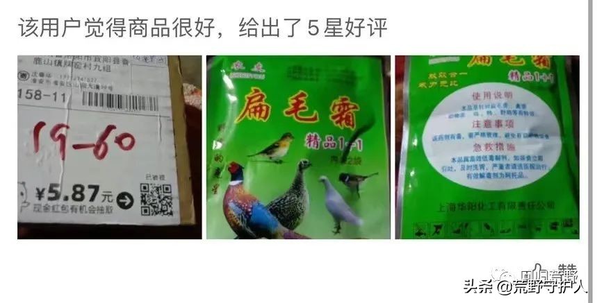 上图是淘宝一个购买来扁毛霜购买者在商品下方的评价。类似的,很多人用扁毛霜来毒鸟,毒死的鸟用来来自己吃或者卖给野味店,类似的行为一旦出事遍是害人害己。