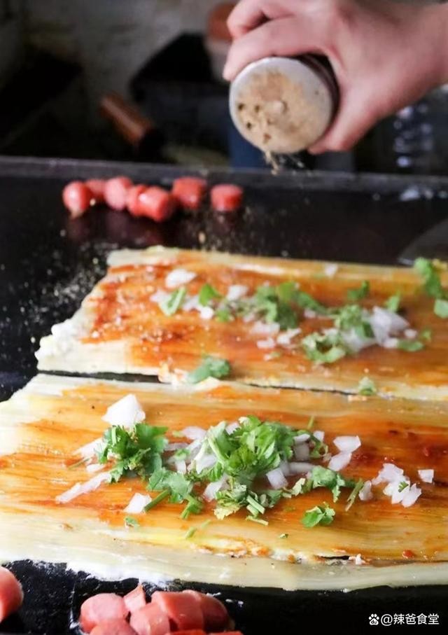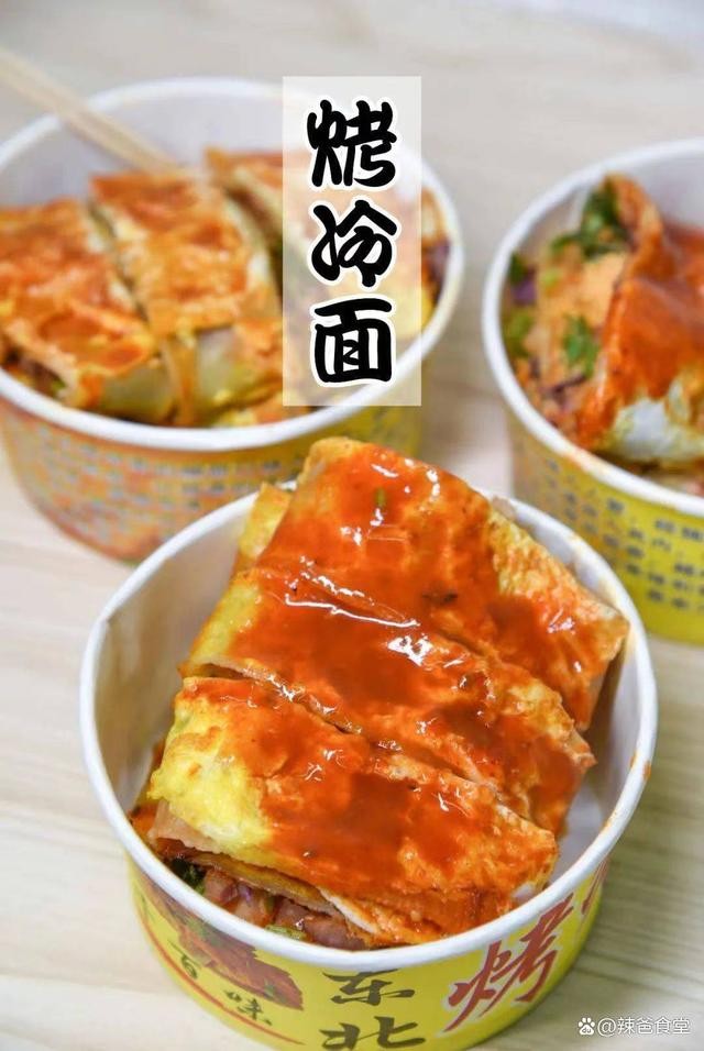 啥是“烤冷面”?烤冷面是来自东北的美味街头小吃。冒着烟、“滋滋”作响的铁板上烤着面皮,面皮在铁板的煎烤下逐渐变脆。秘制酱料刷在面皮上,撒上芝麻、孜然、葱花香菜,按个人喜好可以加鸡蛋、火腿肠。最后卷起再用铲子切开,就可以吃了!就是这样一道东北地方小吃,近几年火遍大江南北,全国各地到处都有东北“烤冷面”。据说这个小吃是黑龙江密山市的一个姓盖的人发明的。