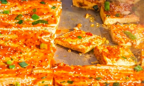 铁板豆腐有说是源自日本铁板烧,也有说是源自韩国。但不论源自哪里,来到了中国后都会被进行改良、优化,最后变得更受国人喜爱。无论在集市中、夜市上、路边摊,经常会看到“铁板豆腐”的小摊。铁板上“滋啦滋啦”地煎着一片一片的豆腐,豆腐的两面煎成脆脆的金黄色,两面都要刷上秘制辣酱,最后撒上葱花香菜末,装入一次性的纸碗里,递给你。吃一口,外焦里嫩、满口留香。