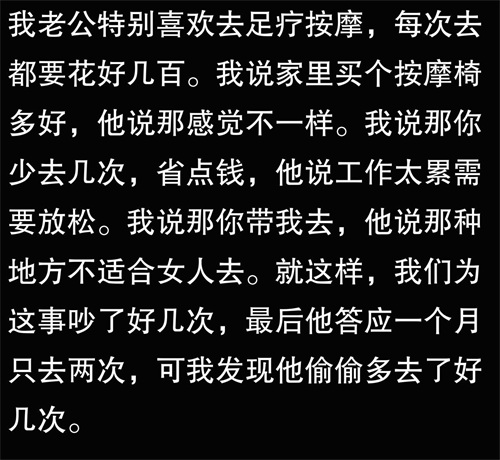 以前我也经常去足疗按摩,觉得挺放松的。后来工作压力大了,收入不稳定,家里还有房贷要还,就很少去了。现在偶尔去一次,感觉也没以前那么享受了,总想着省钱。老婆也经常说我乱花钱,两个人经常为这个吵架。