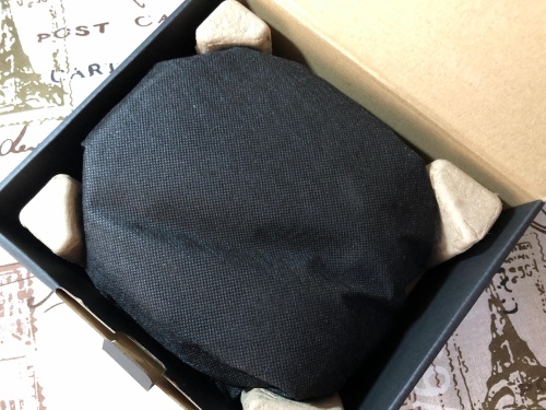 打开“黑匣子”之后,我们会看到耳机很好地固定在盒子里,四角都有防撞的保护。耳机本体则封印在一个黑色的袋子中。
