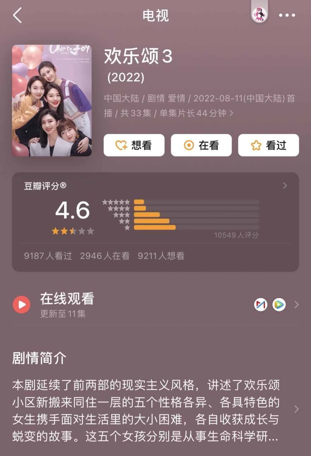 播出了11集的《欢乐颂3》在豆瓣开分,4.6分的成绩,创下了正午剧有史以来评分新低。