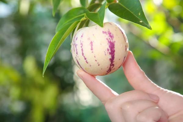 二、看色泽。好吃的人参果表皮光滑,熟了的表皮泛着月白或金灿灿的光,夹杂紫色纹路。