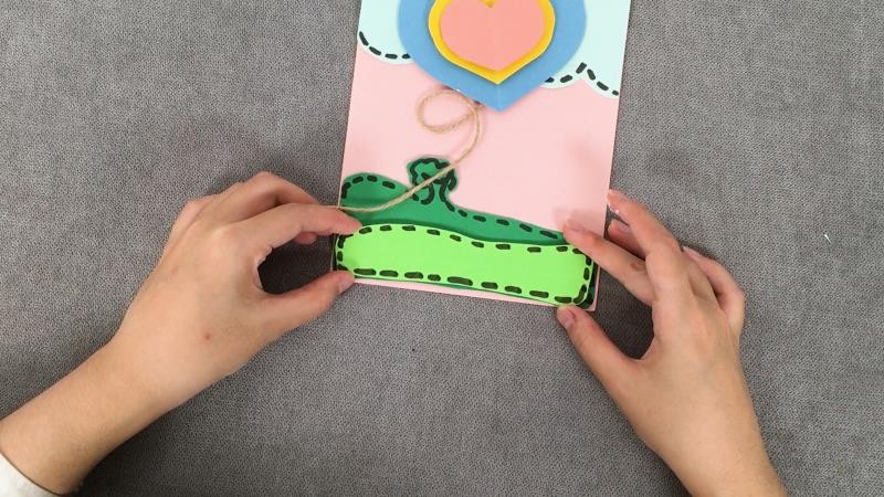 8、将麻绳粘贴在爱心背后,绕个弯