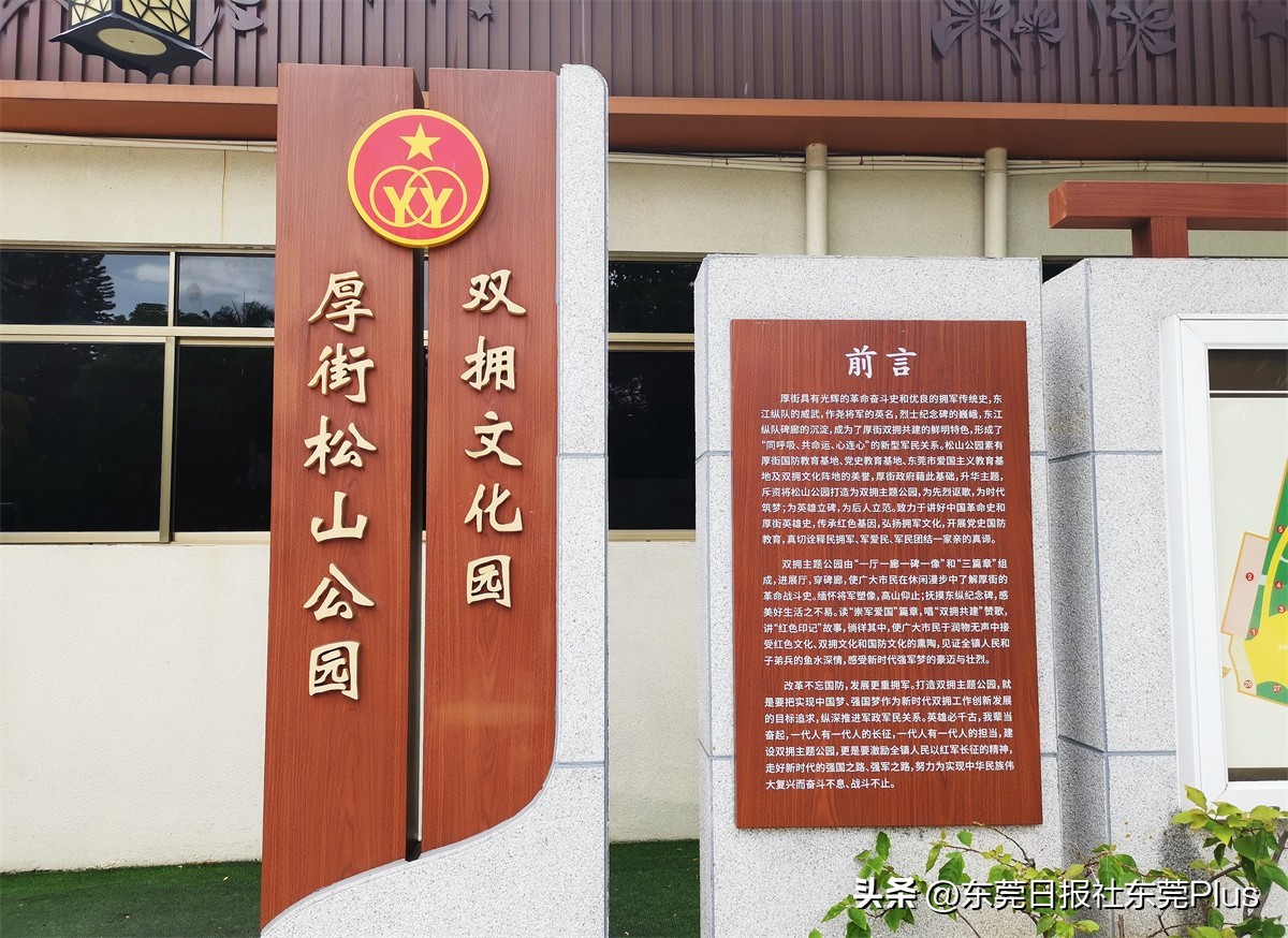 松山公园始建于上世纪90年代,内有王作尧雕像、东江纵队纪念碑廊、厚街革命烈士纪念碑等。2020年,厚街镇斥资将松山公园升级改造为主题突出、特色鲜明、内容丰富的新时代双拥文化园,以“一环、两核、三区、多节点”为脉络,将园区内环形主路作为展示主线路,以革命烈士纪念碑和王作尧将军雕像作为两个园区核心,根据主题划分为“崇军爱国同心筑梦”“双拥之园携手共建”“红色印记不朽丰碑”三大展示区域,每个区域分别以雕塑建筑、景墙、宣传展板等形式,以全新视角展示厚街红色文化底蕴,成为集国防教育、双拥活动和居民健身锻炼于一体的“红色地标”。
