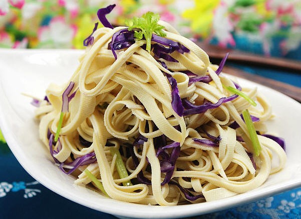 3、分别将紫甘蓝、豆腐皮切成细丝,香菜切成段。