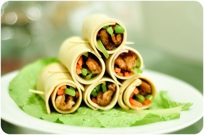 6.豆腐皮置案板上铺开,一一包馅成卷,在合口处涂上面浆(共包成30个春卷)。