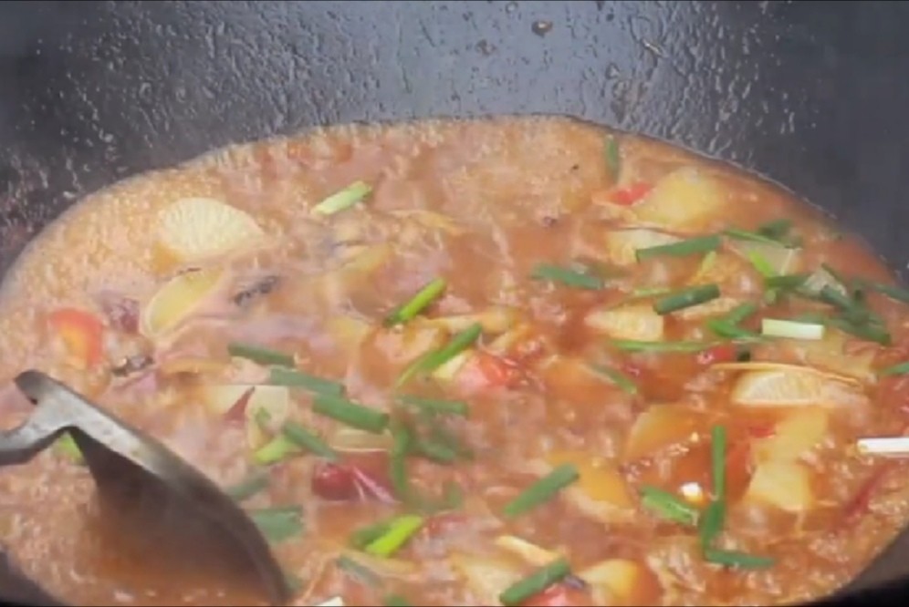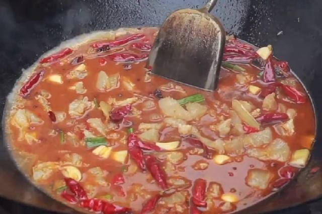 1、烧锅下入150克清油、油温六成热下入50克豆瓣酱炒出红油,下入姜片、蒜、大葱、八角、香叶、桂皮、花椒、泡红椒。