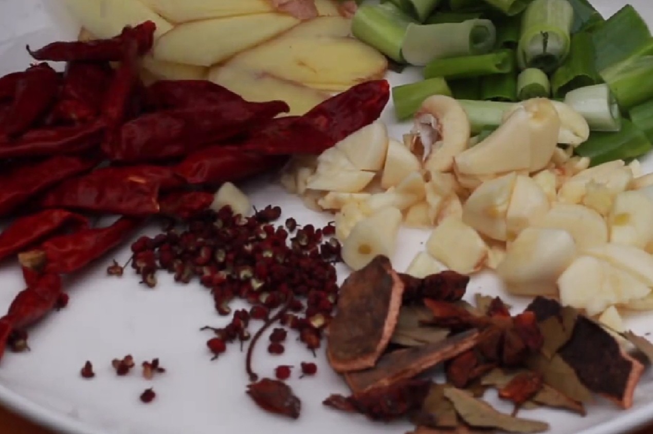 姜片20克、大葱50克、蒜20克、干辣椒15克、泡红椒20克、花椒3克、八角3个、桂皮5克、香叶5片。