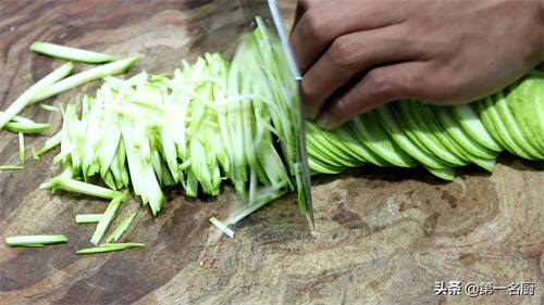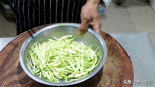 准备西葫芦一个,先切去头尾,再切成薄片,然后改刀切成细丝,放入盆中备用。
