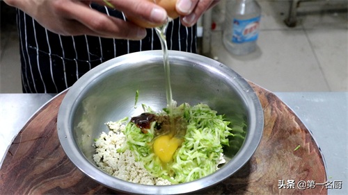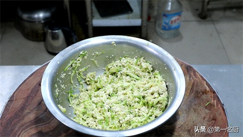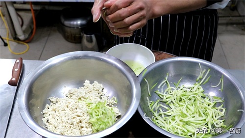 等西葫芦丝腌好以后,用手挤去水分,和豆腐放在一个盆中。