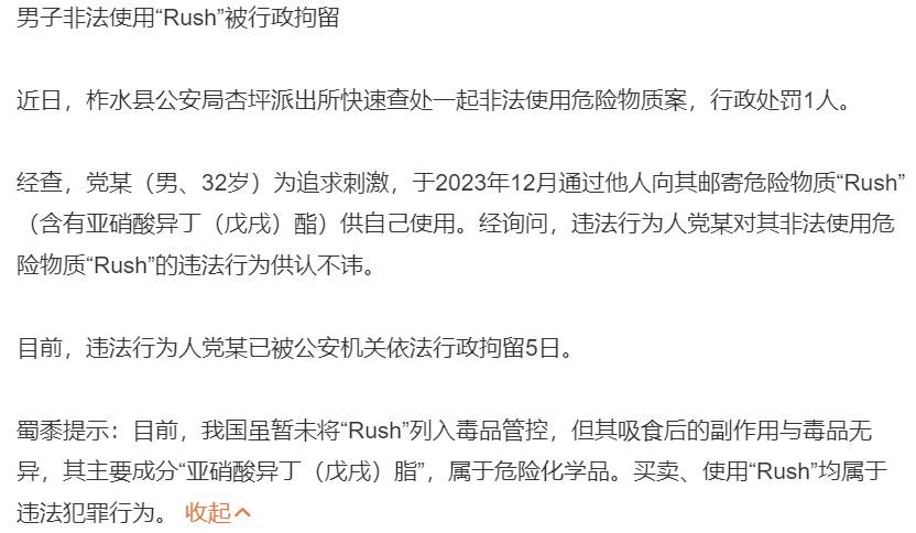 非法使用“Rush”,柞水男子被行政拘留:兴奋剂的危害你了解吗?