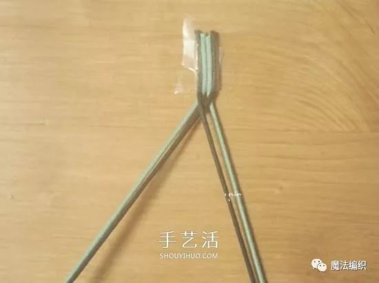 用透明胶把四股绳固定在桌面上。