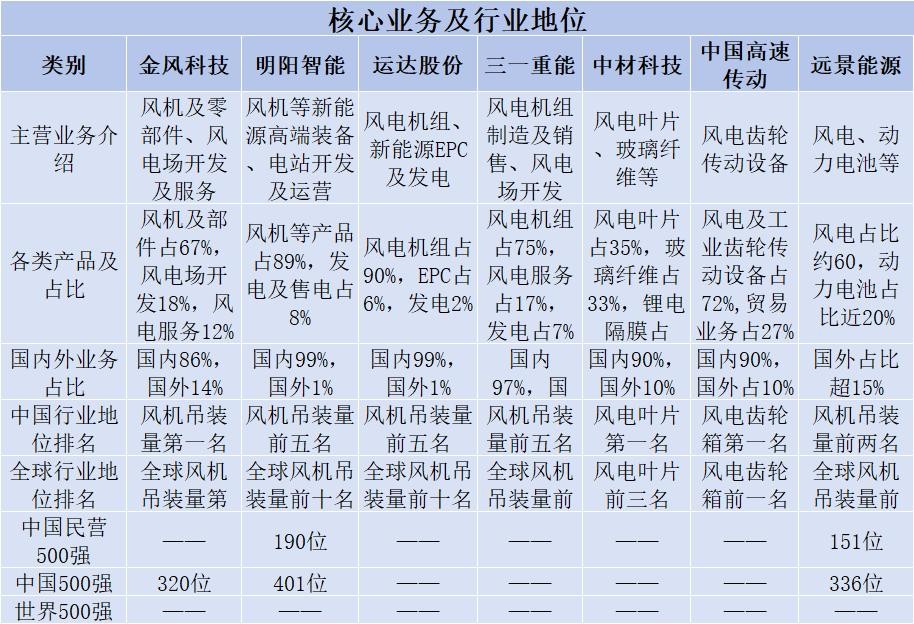 7家企业主营业务均为风电设备,其中中材科技以风电叶片为主,中国高速传动以风电齿轮传动设备为主,其余5家以风电机组为主。