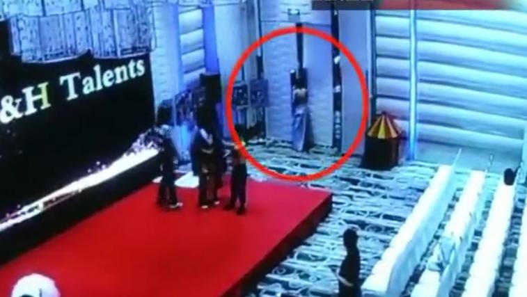 由上图可以看到酒店正在举报活动,有一位女子去开门,打开门的瞬间右半边门直接向下倒去,不幸的是门下有一位儿童。